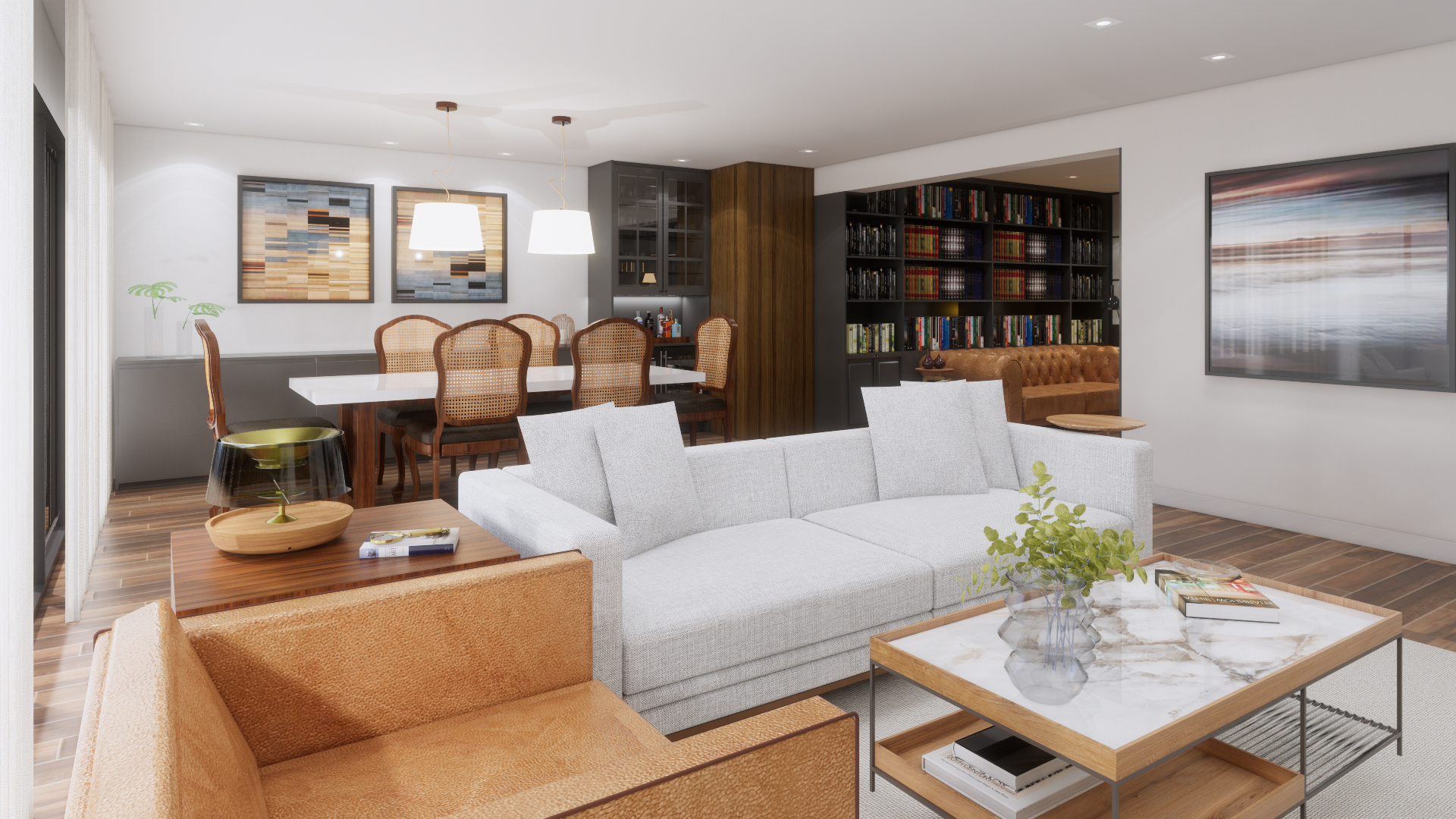 O projeto Novo Leblon foi concebido para ser um refúgio de sofisticação e cultura no coração do Rio de Janeiro. A área social é marcada por uma integração fluida que valoriza a convivência, onde uma ampla biblioteca de marcenaria sob medida se torna a protagonista do ambiente. A curadoria de design mistura peças icônicas, como a poltrona em couro capitonê, com linhas retas e modernas. O uso de painéis em boiserie escurecida traz uma atmosfera de biblioteca clássica europeia, enquanto a iluminação pontual garante o aconchego necessário para um lar acolhedor.